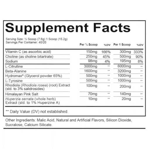 Mezclar una porción con agua y consumir antes del entrenamiento. Puede usarse solo o combinado con un pre entrenamiento con estimulantes, según las necesidades individuales.