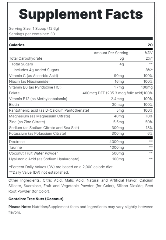 Redcon1 Canteen es un suplemento en polvo diseñado para optimizar la hidratación y el rendimiento físico. Su fórmula avanzada combina electrolitos esenciales como sodio, potasio y magnesio, junto con agua de coco en polvo y ácido hialurónico, favoreciendo la reposición de líquidos y el soporte de músculos, articulaciones y piel.