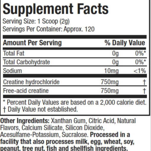Cell-Tech Creactor es un suplemento de creatina en polvo formulado con creatina HCl y creatina libre, diseñado para apoyar el aumento de fuerza, el rendimiento y la recuperación muscular. Su fórmula sin azúcar ni carbohidratos permite una absorción eficiente y un uso diario limpio, ideal para entrenamientos intensos.