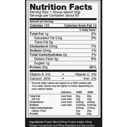 Mezclar 1 scoop (~30 g) con 240 ml de agua o leche. Consumir después del entrenamiento o como reemplazo de comida. Se pueden tomar de 1 a 3 porciones diarias según necesidades nutricionales.