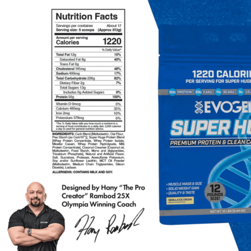 Super Huge Mass Gainer de Evogen es una fórmula avanzada diseñada para quienes buscan aumentar masa muscular de forma efectiva y con calidad. Combina proteína premium, carbohidratos limpios y grasas saludables para ayudarte a crecer con control y sin acumulación innecesaria de grasa.