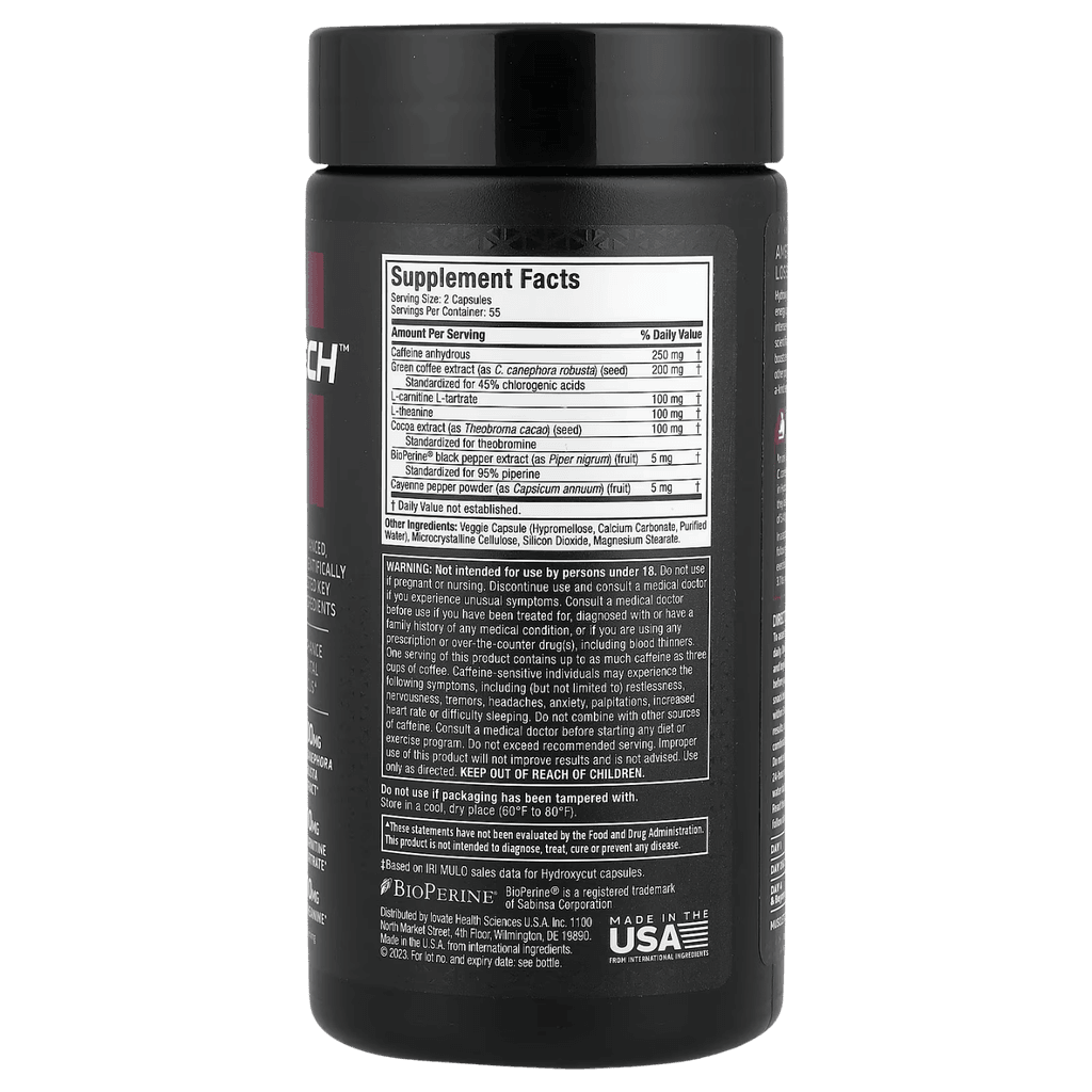 Hydroxycut Hardcore Elite de Muscletech es un potente termogénico diseñado para apoyar la pérdida de grasa, elevar la energía y mejorar el enfoque mental. Su fórmula combina cafeína anhidra, extracto de café verde, L-teanina y otros compuestos clínicamente investigados para potenciar el metabolismo y el rendimiento físico.