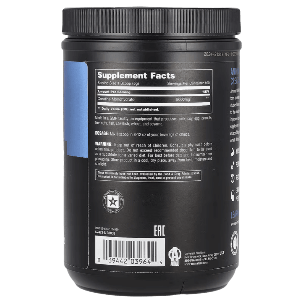 Animal Creatina Monohidratada es un suplemento de creatina pura 100% micronizada, formulado para apoyar el incremento de fuerza, potencia y desempeño en entrenamientos intensos. Esta versión micronizada mejora la disolución y absorción, asegurando que tu músculo reciba rápidamente la energía que necesita para rendir al máximo.